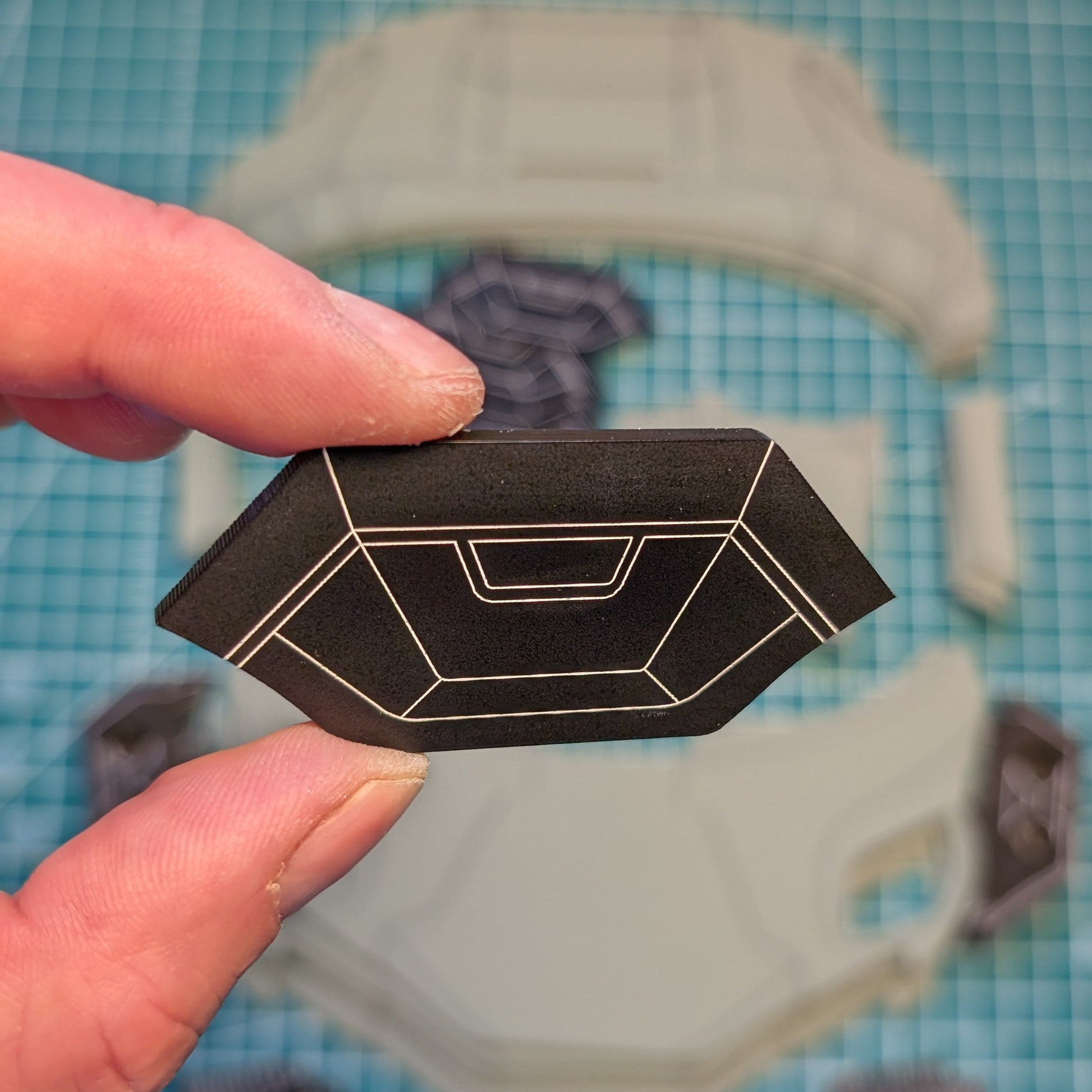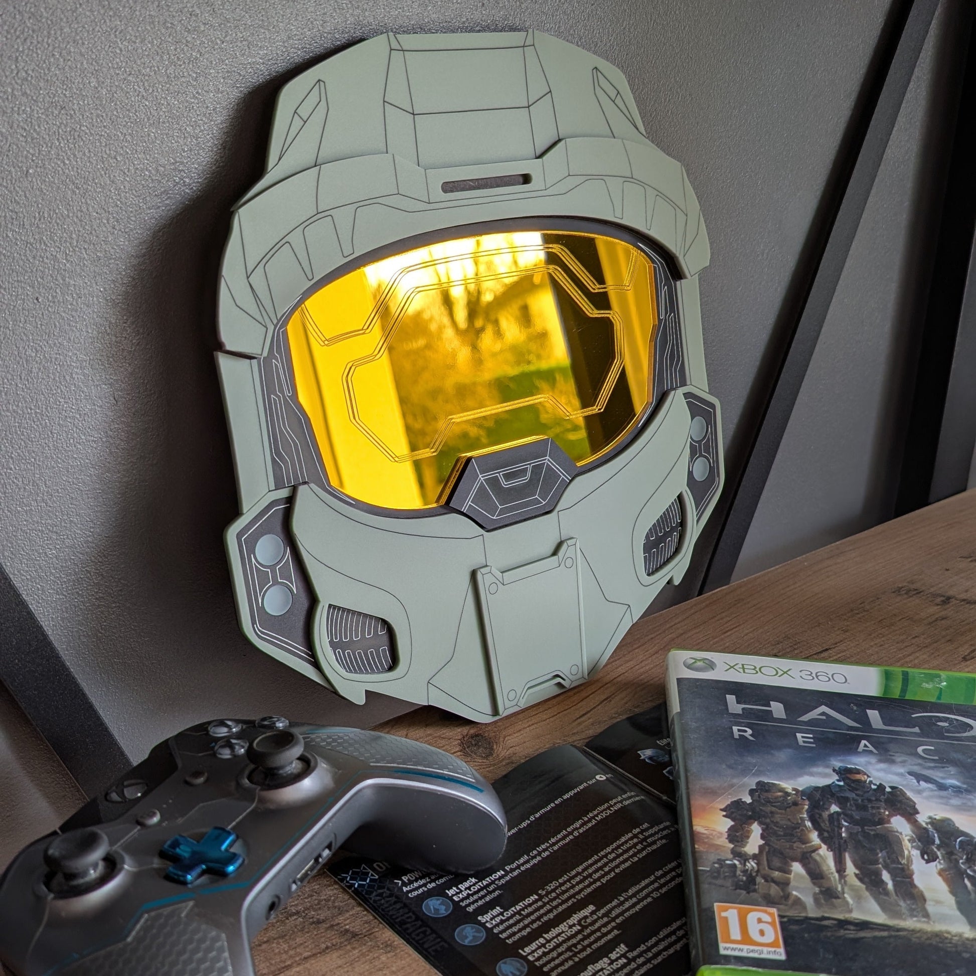 Ce casque du Masterchief a été pensé pour être décomposé selon plusieurs épaisseurs et ainsi mettre en valeur du mieux possible les différents éléments présents sur le casque!
